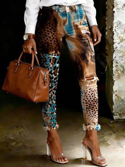 Women's Vintage Gradient Leopard Print Art Ripped Skinny Jeans