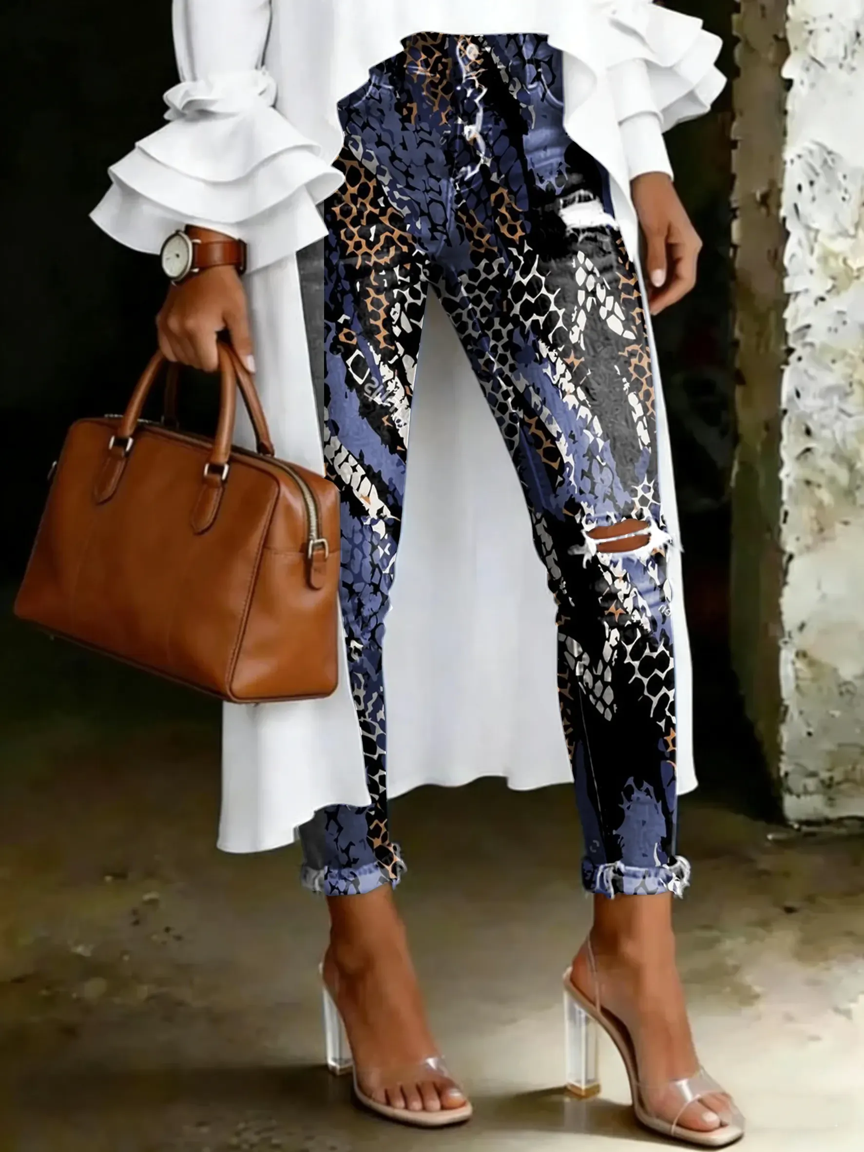 Women's Vintage Leopard Totem Print Casual High-waisted Ripped Skinny Jeans