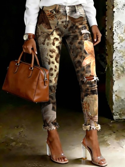 Women's Vintage Lily Floral Leopard Print Art Ripped Skinny Jeans