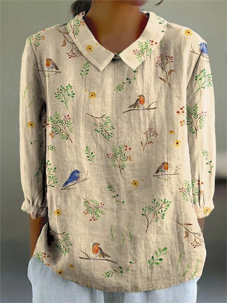 Women's Vintage Lovely Birds Floral Art Print Casual Cotton And Linen 3/4 Sleeve Shirt