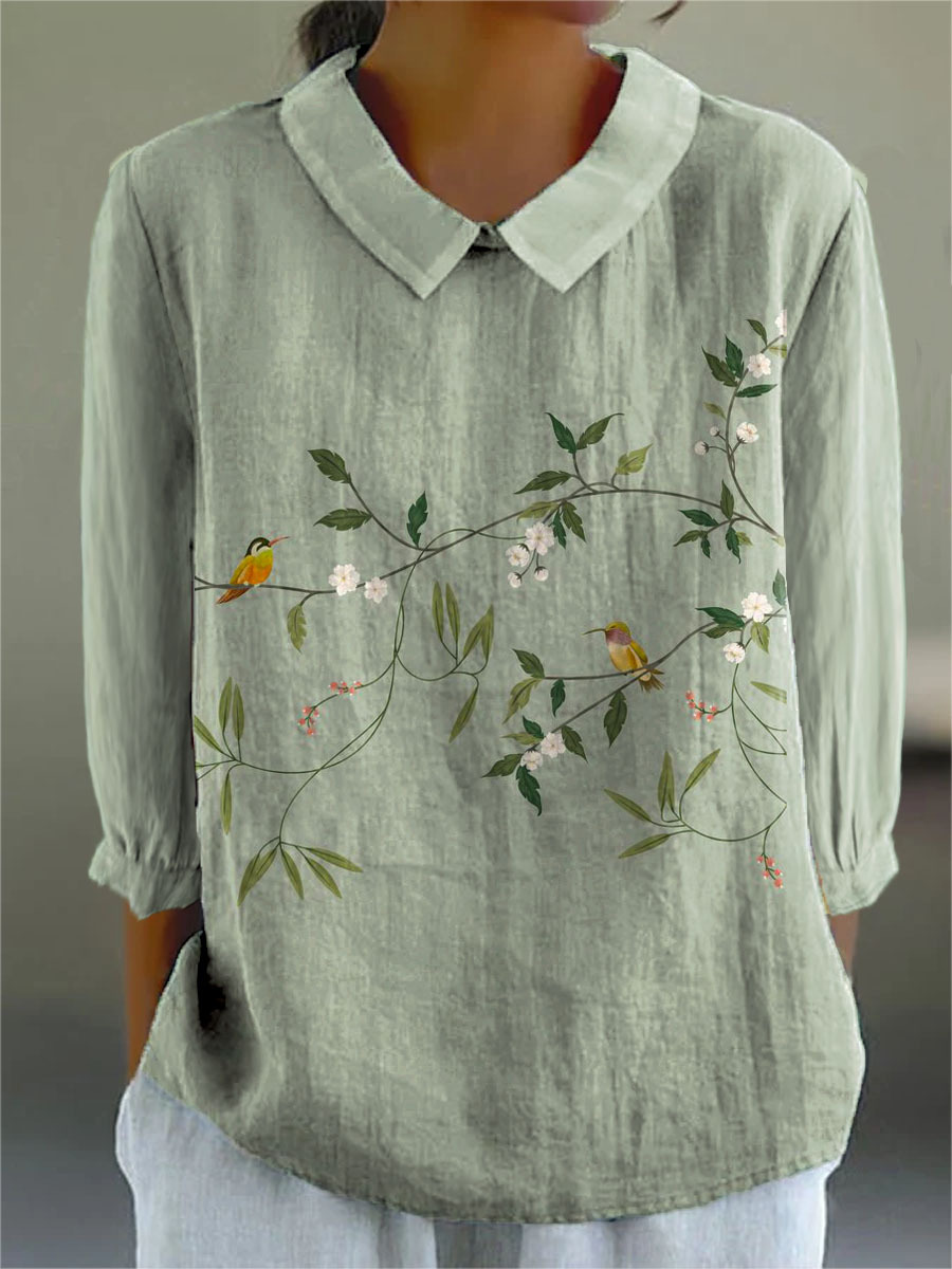 Women's Vintage Lovely Floral Birds Art Print Casual Cotton And Linen 3/4 Sleeve Shirt