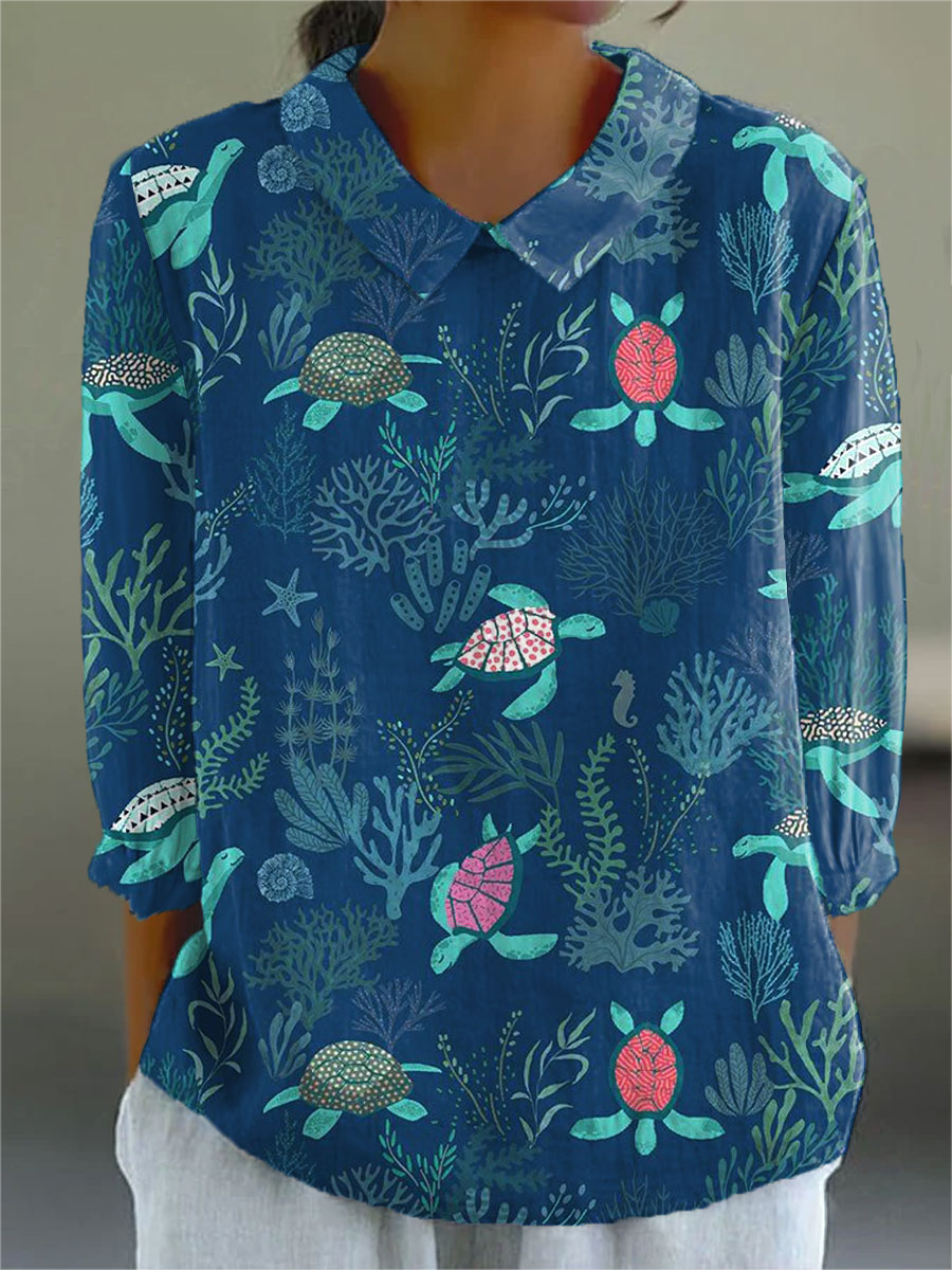 Women's Vintage Turtle Art Print Casual Cotton And Linen 3/4 Sleeve Shirt